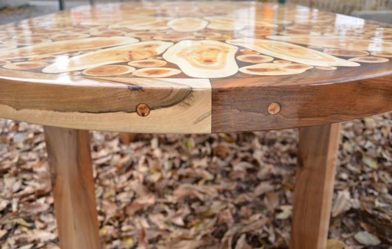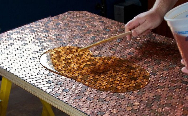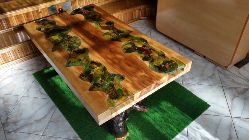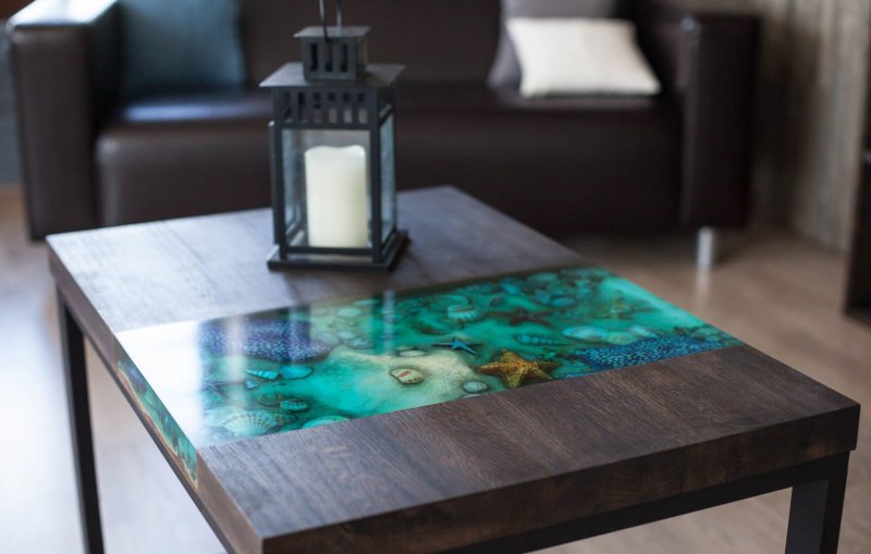 Если при изготовлении стола добавить декоративное наполнение, то получится эксклюзивный продукт. В качестве вложений применяются разные материалы: мраморная крошка, полудрагоценные камни, галька, вертки, ракушки, поеденные короедами кусочки древесины. Но истинные шедевры получаются при использовании памятных сувениров.