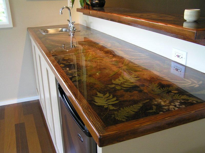 Даже при самостоятельном изготовлении столешница получается достаточно дорогой. Для ее заливки необходимо соорудить опалубку, которая придаст смоле задуманную форму предмета. Для этого используют стекло, которое очень тщательно очищается и обезжиривается. При сборке опалубки особое внимание уделяется стыкам, наличию трещин, других дефектов.