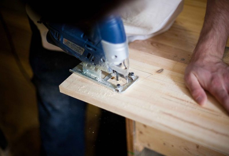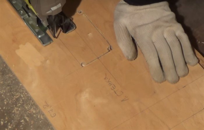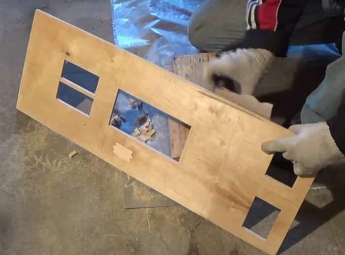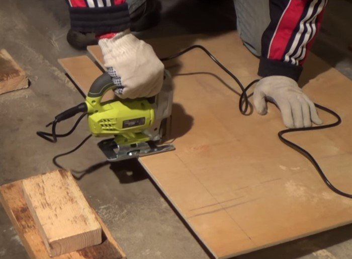 Ножовкой или электролобзиком вырезаем элементы конструкции, выпиливаем оконные проемы, двери.