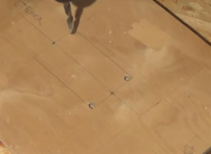 Чтобы вырезать окна и двери лобзиком, сверлим по намеченным краям отверстия.