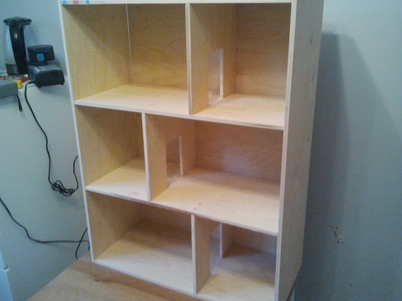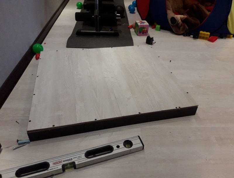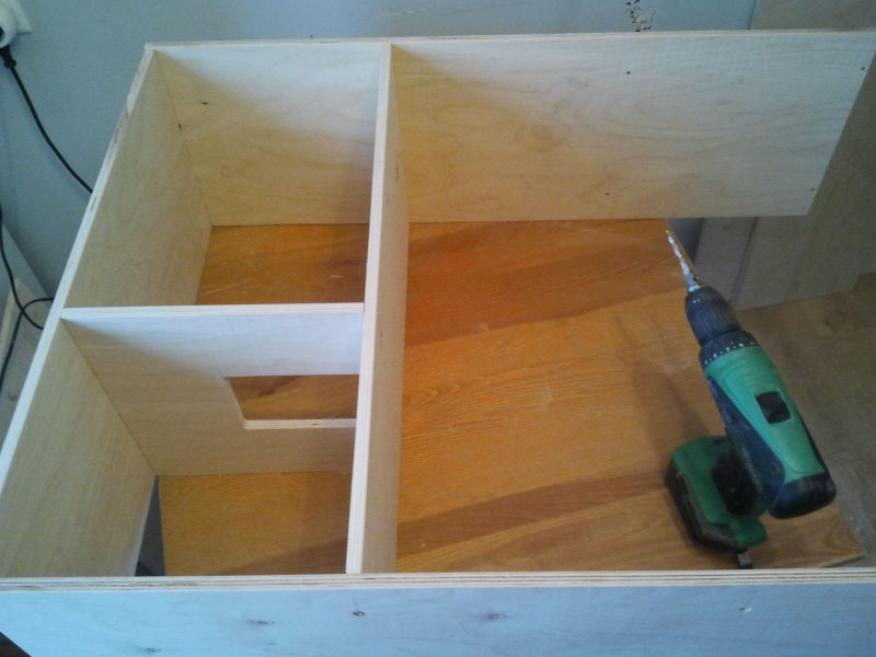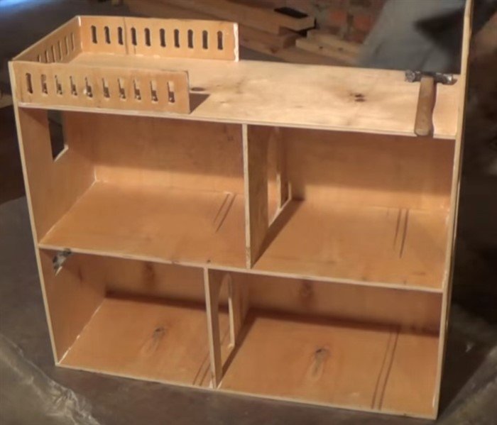 К основанию крепим боковые стены и перегородки. Фиксация происходит саморезами. В местах их вкручивания обязательно сверлятся отверстия, чтобы лист ДСП не расслоился;