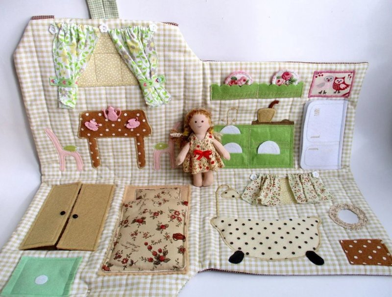 Для каждой отдельной комнаты пришиваем кусочки ткани, имитируя характерные предметы. Например, в спальне можно разместить шкаф с открывающимися дверцами, кровать, в которую можно уложить небольшую куколку. В ванной комнате – умывальник с зеркалом, душ.