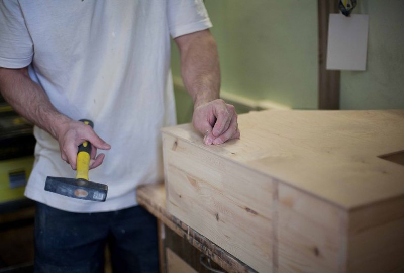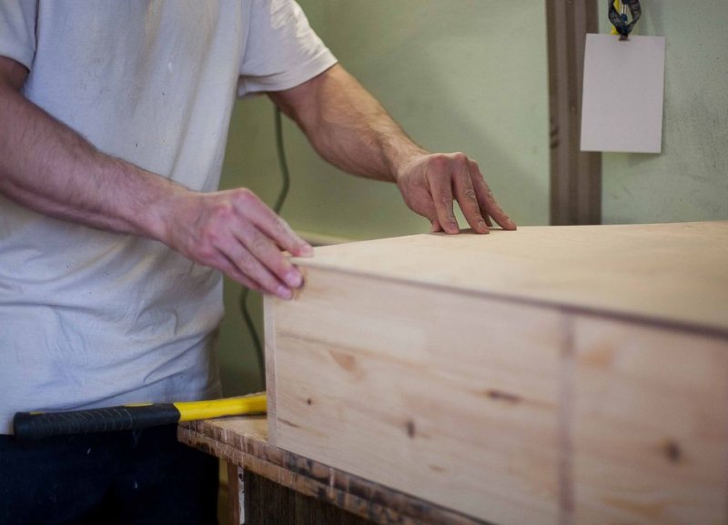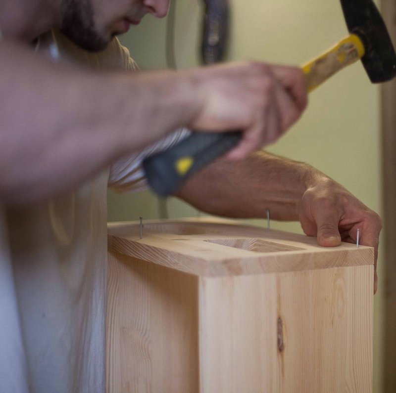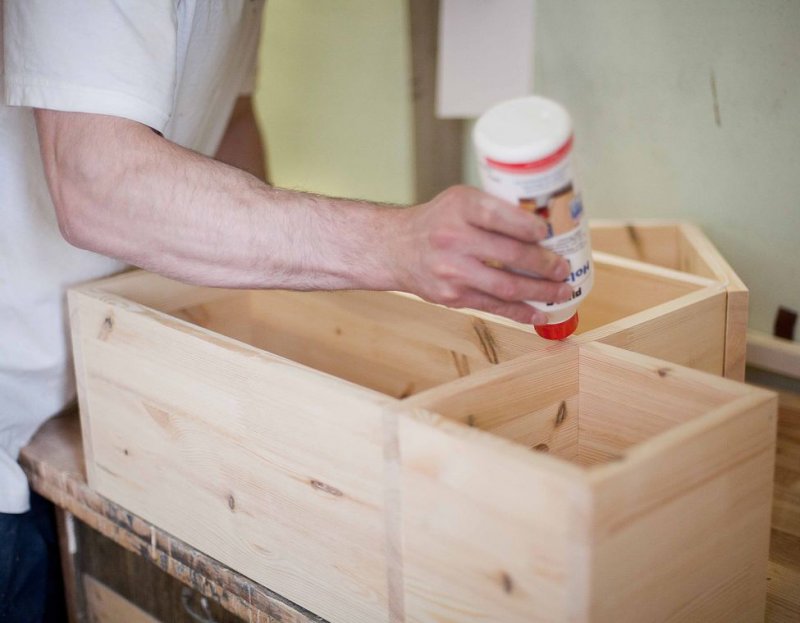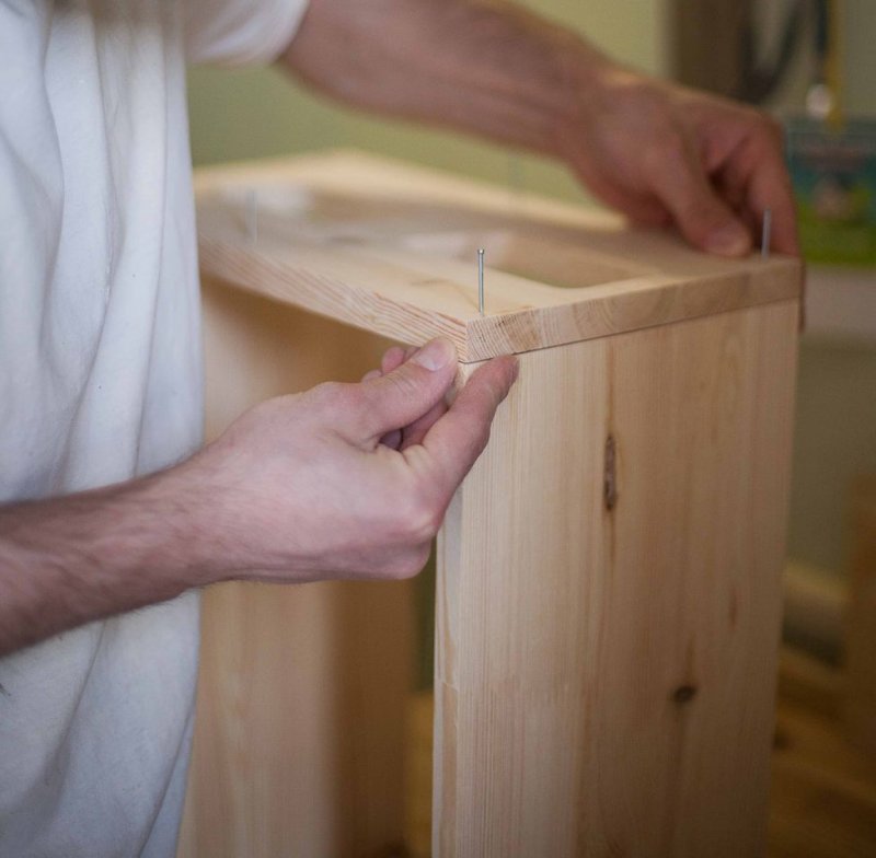 Используя клей или гвозди, соединяем все элементы, начиная с присоединения к основанию боковых стен, потом переходим к задней.