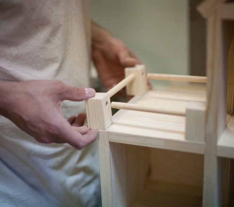 При необходимости устанавливаем балкон. Для этого берем четыре одинаковых бруска прямоугольной формы, в них делаем отверстие у верхнего края, куда вставляем круглые рейки, служащие перегородками. Далее эта конструкция устанавливается на специальном выступе.