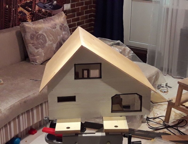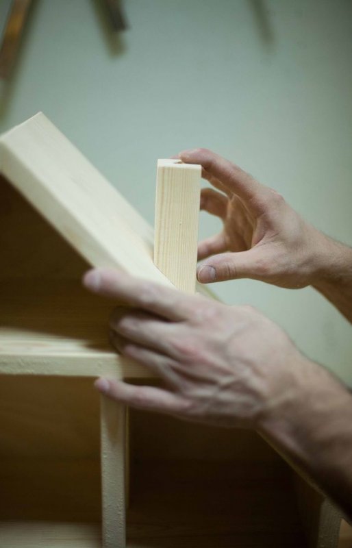 Каркас дома уже готов, остается построить крышу. Для этого измеряем ширину шкафа и его глубину. После чего обрезаем доски, на верхнем стыке делая уклон 45 градусов. Т.к. глубина шкафа шире стандартной доски, придется сколотить несколько штук вместе. После установки крыши усиливаем ее перегородками по бокам, заодно разделяем чердачное пространство на несколько частей.