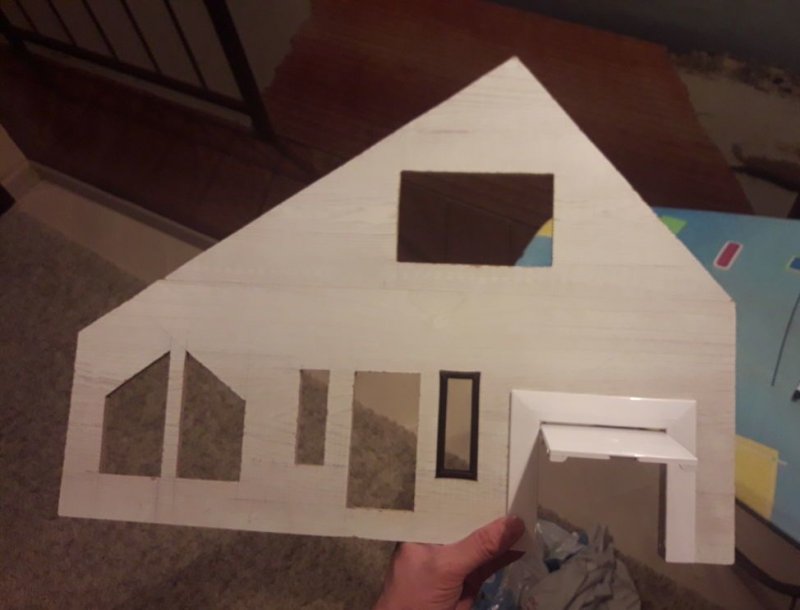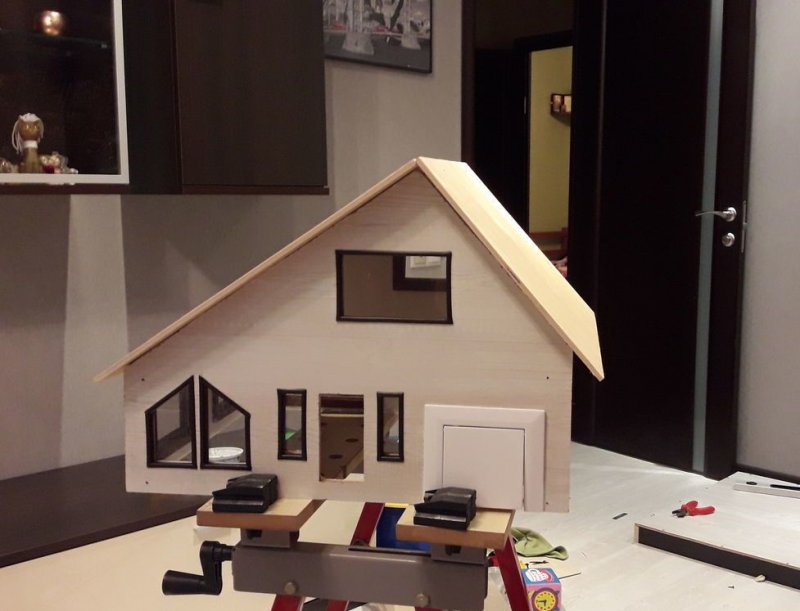 Двери шкафчика можно использовать как лицевую сторону дома, которая закрывается. Далее вырезаем окна, при необходимости – дверной проем, применив лобзик и дрель.