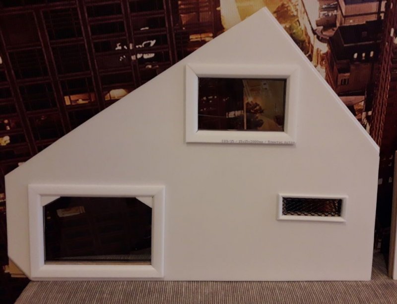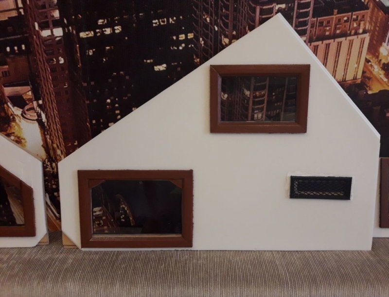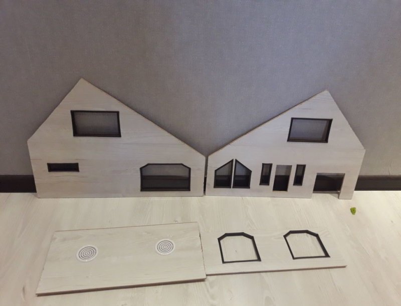 С лицевой стороны вырезаем окна, дверной проем и въездные ворота в гараж. На боковой стене со стороны гаража делаем круглые отверстия дрелью с насадкой, они будут служить вентиляционными люками. Окна по бокам не требуются, их лучше сделать на задней перегородке.