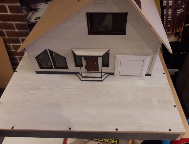 В качестве задней стенки используем лист фанеры, ДВП толщиной более 3 мм. Она должна выходить за все края на несколько мм. После ее закрепления фрезерной машинкой завершаем обработку стен дома.
