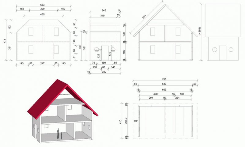 Важным этапом проектирования является определение размера и формы домика. Он может быть одно-, многоэтажный. Иметь прямоугольную, квадратную форму. Возможно создать замок с круглыми башнями. Параметры изделий разные, все зависит от площади детской комнаты, пожеланий ребенка, фантазии автора. При создании эскиза комнат следует учитывать следующие требования:
