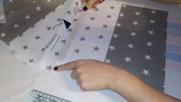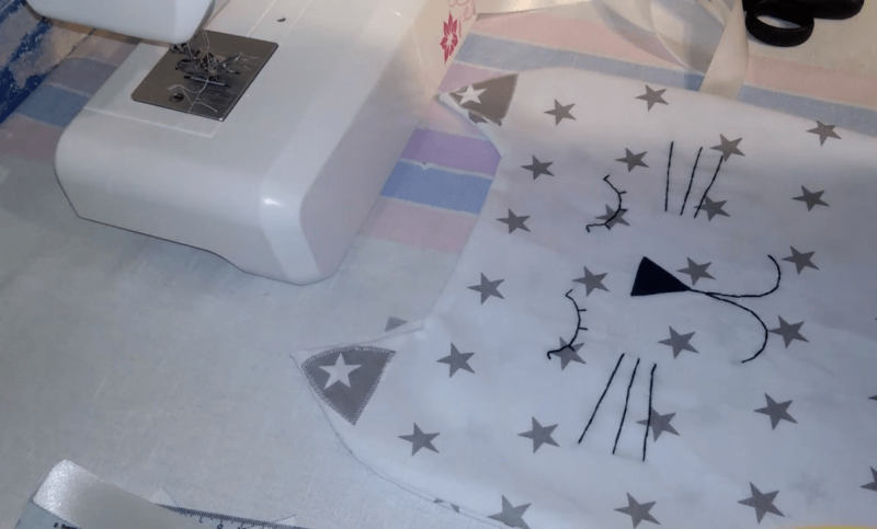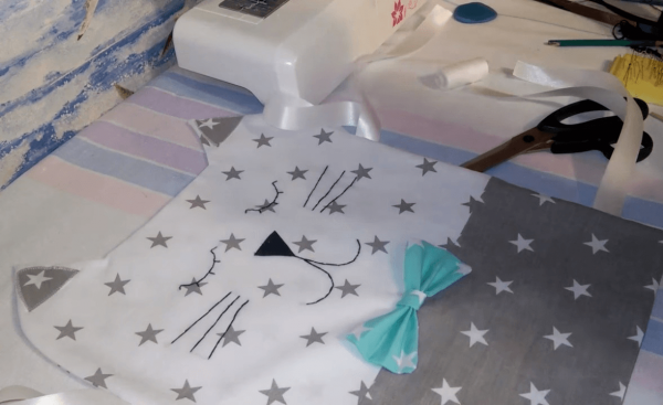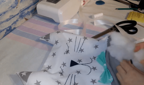Сначала делаем выкройку и переносим ее на ткань. На образцах должны быть размеры самого котика, его ушек, носика и щечек. На ткани к выкройке верхней части тела нужно добавить по всему периметру 1 см для припусков. Нижняя часть делается размером 34x17 см, учитывая припуски. Мелком или исчезающим маркером рисуются рот, носик, усики, глазки. Необходимо придерживаться симметрии. Далее, нижнюю полоску пришиваем к верхней части тела и выглаживаем швы в одном направлении. Затем из фетра вырезаются носик, щеки и ушки. Детали пришиваются мелким зигзагом. Усы, ротик и глаза вышиваем ниткой прямой мелкой строчкой на два-три раза. Две 50-сантиметровые ленты складываем вдвое и присоединяем к изделию с помощью булавок. Тыльная деталь изделия выкраивается в таком же размере, как и передняя. Потом они соединяются, подушка выворачивается и набивается. Отверстие зашивается скрытым способом. Котика следует украсить бантиками.