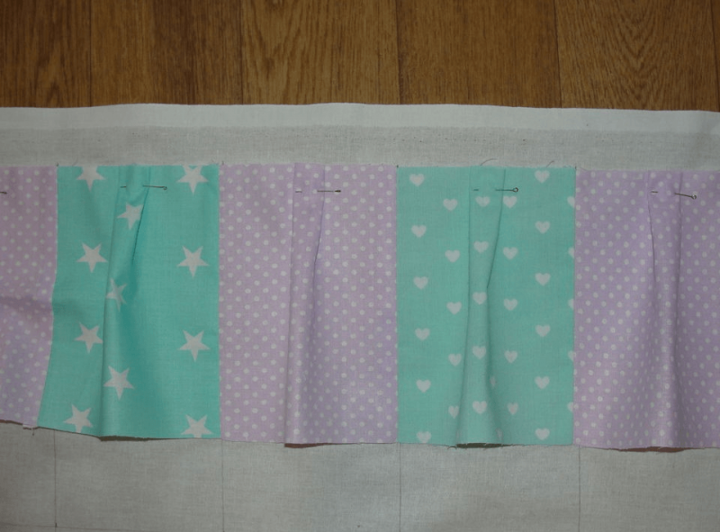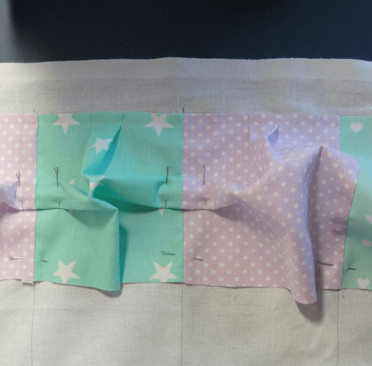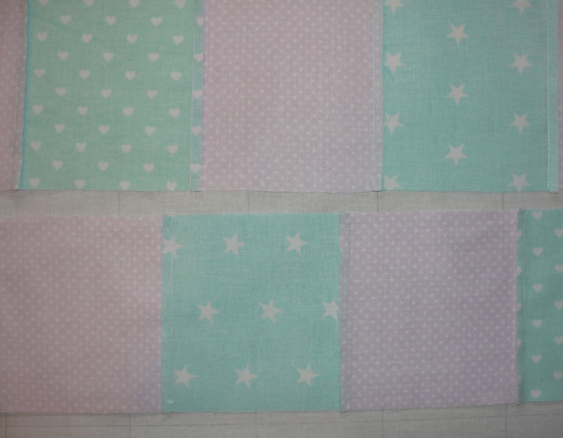 Изделие будет состоять из подушек 60x30 см с маленькими квадратиками размером примерно 10x10 см. Если планируется защитить кроватку с 3 сторон — понадобится 4 подушки, а если с 4 — то 6. Квадратики бортика бомбона делаются из кусков по 17x17 и 10x10 см. В первом случае это цветная ткань с рисунком, во втором — белая (можно взять бязь). На маленьких квадратных фрагментах делаются надрезы около 5 см. Края больших цветных кусков прикрепляются булавками к маленьким, в местах, где углы обеих тканей соединяются. Далее формируются складки, которые также фиксируются булавками. Каждая сторона прошивается на расстоянии 0,5 см от края. Так делается 18 деталей для одной подушки 60x30 см. Квадратики сшиваются и набиваются наполнителем с тыльной стороны. Необходимо чередовать элементы разного окраса (в идеале самих вариантов расцветки используется минимум 5). Аналогичным образом делаются остальные подушки.