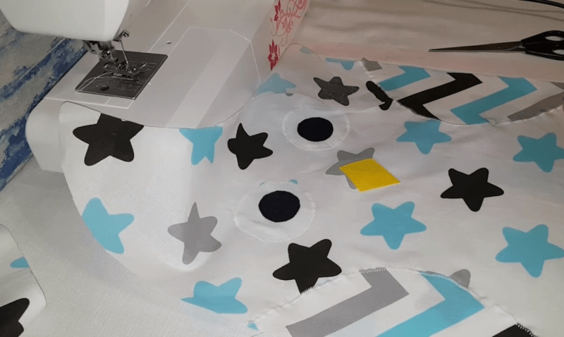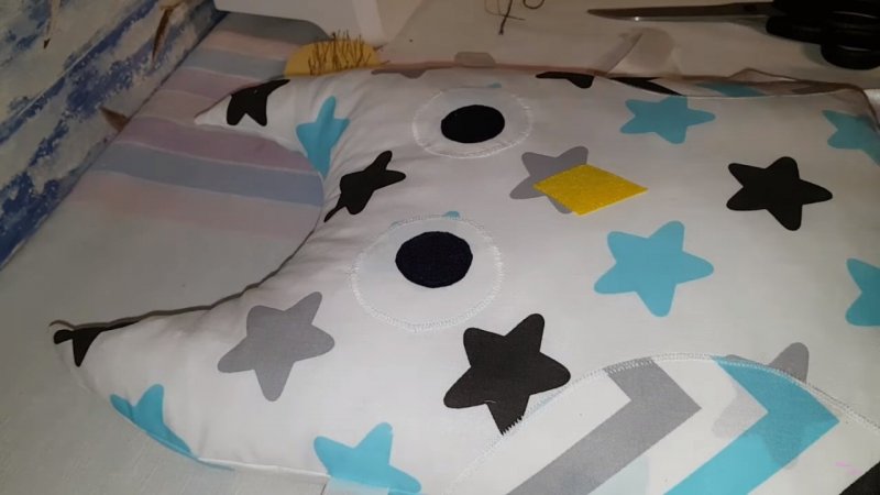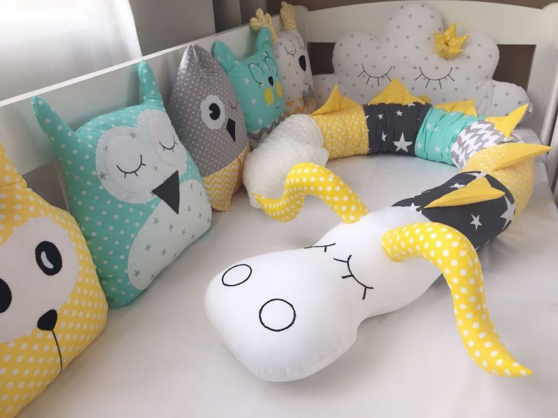 Чтобы сшить бортик-сову, понадобится красивая цветная ткань (можно взять зеленую), лучше с повторяющимся рисунком. Для одного элемента берем полотно размером 50x75 см. Оно разрезается на две части по 50x37,5 см. На них рисуются квадраты 36x36 см, которые «уйдут» на голову совы. Оставшиеся участки необходимы для создания ушей, их тоже понадобится чертить на ткани. Далее, потребуется кусок белой материи 27x20 см для создания глаз. Они делаются одной фигурой, с переходом. Крылья вырезаются из материала другого цвета. С зеленым хорошо сочетается серый. Можно взять бязь, серую в белый горошек. На ней отмечается прямоугольник шириной 14 и длиной 16—17 см. На этом фрагменте рисуется дуга. Клювик можно вырезать из того же материала. Он подкладывается под глаза. Все детали лицевой стороны подушки крепятся и прошиваются швейной машинкой, швом зигзаг. Затем карандашом рисуются глаза в виде уголков, опущенных вниз. Потом они оформляются серыми нитками. В конце лицевая сторона и основание соединяются и наполняются набивочным материалом.