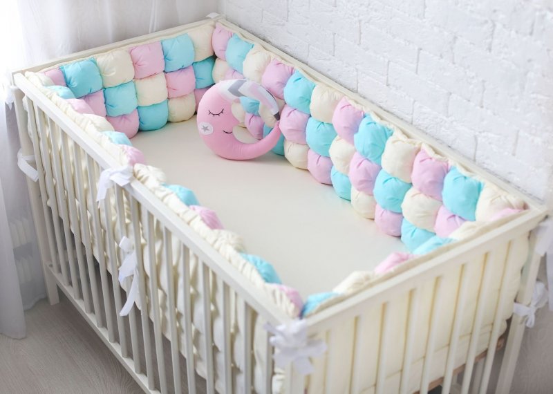 Имеется большое разнообразие в зависимости от характеристик. По типу конструкции бывают съемные и несъемные бортики. Первый подтип встречается намного чаще и характеризуется большим выбором способа размещения. Несъемные бывают цельными и с проемами. Такой вид защиты полностью обезопасит ребенка от вероятности получения травм. Изделия могут предназначаться для мальчиков или девочек. В первом случае они выполняются в холодных тонах или в желтом цвете. Для девочек подойдет любой окрас, кроме темного, в первую очередь розовые и пастельные оттенки. По способу крепления существует 2 типа защитных подушек: на завязках и на липучках. В первом варианте элементы крепления находятся по краям изделия. Во втором случае застежка скрыта, поэтому малыш не будет обращать на нее много внимания. Еще бортики в кроватку отличаются по высоте (высокие, низкие). Встречаются модели бомбон с мягкими квадратами и коса, которую несложно сделать самостоятельно.