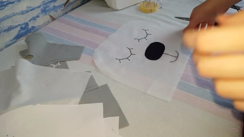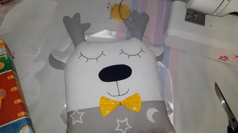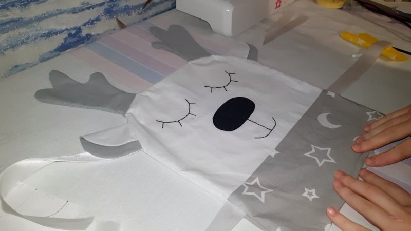 Еще потребуется хлопковый материал в 2 расцветках, белая ткань, атласные ленточки по 60x2,5 см, наполнитель, нитки мулине для ротика и глазок, карандаш или портновский мел, ножницы и булавки. Первым делом выкройки в форме тела прикрепляются к белой ткани и ножницами вырезается необходимый элемент, с учетом припусков. Нужно две такие детали. Рожки, уши и носик вырезаются из различных тканей (фетра и пр.). Делать припуски для носа не нужно. Потом берется белый материал в виде головы и на нем нитками мулине делаются глазки и ротик, а также крепится и прошивается вырезанный носик. Нижняя часть тела (из цветного материала) аккуратно пришивается к голове. Затем к ней крепятся рожки и ее верхняя часть строчится, включая длину краев рожек. Следующим делом прикалываются ушки. После этого крепятся ленты. Половины изделия сшиваются и наполняются.