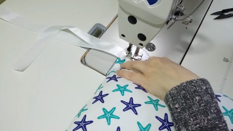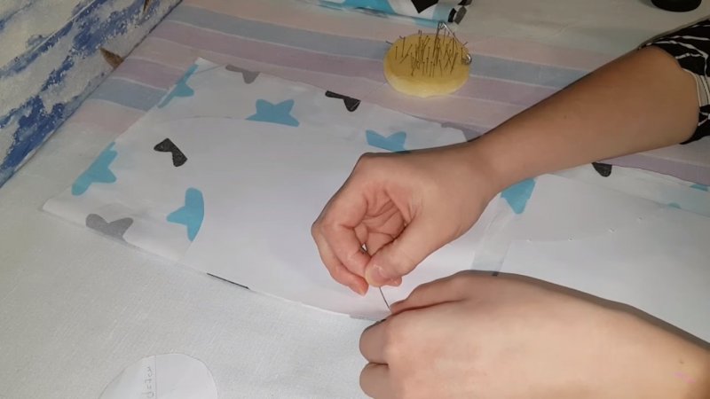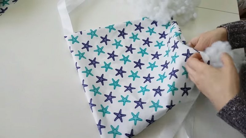 Работа начинается с того, что подкладочная ткань складывается наружной стороной внутрь и сшивается чехол. Оставляется отверстие для наполнителя. Чехол затем выворачивается и в него вставляется необходимый материал. Отверстие аккуратно зашивается, в идеале это делается руками и скрытым швом. Данный порядок действий осуществляется для каждого элемента защиты. Завязки шьются 2 методами — получаются обычные или с липучками. Роль простых завязок способны выполнять ленты и тесьма. Подойдет и основной материал. Количество завязок и их размеры — индивидуальный вопрос. Как правило, требуется два десятка крепежных элементов: по 4 для изголовья и изножья, по 6 для обеих боковин. Рекомендуется шить больше крепежных деталей для более надежной фиксации. Если создаются именно бортики-подушки, то на каждую необходимо минимум 2 завязки. В случае с декоративными чехлами нужно заранее отметить расположение крепежных элементов и приметать их.