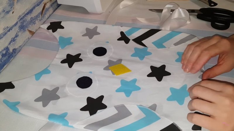 Для этого предназначены оборки, аппликации, крупные пуговицы, банты, ленты и пр. Если подушки украшаются по всей длине кружевами или оборками, то нужно их приметать или вшить в основные швы. Декор может располагаться и на лицевой стороне чехла. Бампер и каркас рядом с ним также украшают аппликациями, узорами и рисунками. Из соображений безопасности бортики делаются очень мягкими, декорируются аналогичными по мягкости тканями (например, фетром). Такие изделия еще называют бортами-противоударниками. Для украшения бортиков и прутьев применяют также наклейки с рисунками, в том числе наклейки для мебели. Их следует размещать на внешней части подушек и внутренней стороне прутьев кроватки, чтобы ребенок не отцеплял детали и не подвергался из-за этого опасности. Никак не подходят для декорирования бортиков мелкие предметы вроде камушков и страз.