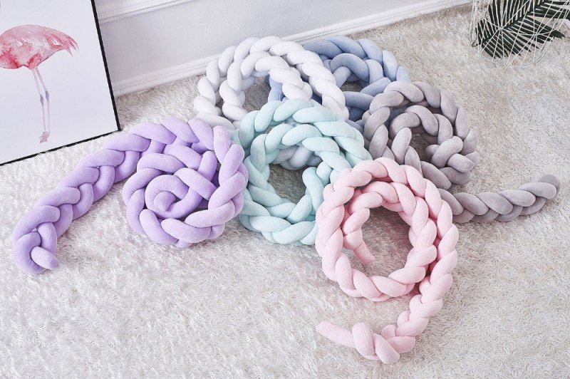 В качестве ткани лучше выбрать что-то плотное, например, хлопковый велюр. С ролью наполнителя отлично «справится» холлофайбер. На 1 косичку длиной 120 см уйдет примерно 1 кг данного материала. Вначале определяются со сложностью изделия: бортик-косичку можно делать не только в 3, но и в 4 пряди. Стоит попробовать более сложный вариант. Длина прядей рассчитывается исходя из их количества. Так как боковая сторона кроватки обычно имеет 120 см в длину, то на прядь косы из четырех элементов понадобится 147 см (120 см умножается на коэффициент 1,22). Необходимая ширина — 19 см. Все 4 куска разного цвета соединяются, а затем еще и складываются пополам. Эти действия производятся с помощью машинки. Далее, получившийся рукав плотно одевается на 1,5-метровую трубу и другой, более тонкой, трубой в дальний конец материала набивается холлофайбер.