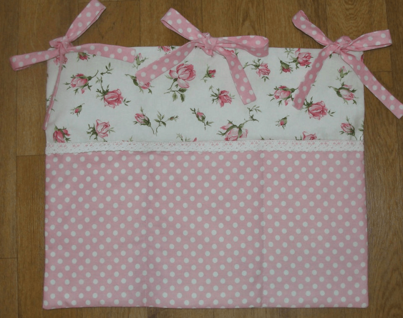 Ширина кармана согласовывается с показателями кровати. Обычно он равен 60 см. Глубину можно сделать немного меньше, около 50 см. Материю в полоску складываем вдвое и гладим. То же самое делаем с белым материалом. Затем на сложенную белую ткань накладываем полосатую. Обе размещаем свободными краями вниз. Затем прошиваем изделие по границам полосатой ткани, но линию посередине оставляем свободной, лишь разделив ее на две половины. Далее, сшивается задний элемент кармана. Он укрепляется синтепоном. Складываем ткань на этот наполнитель и закалываем. Верх и бока строчим. Потом обе главных детали складываем лицевой стороной внутрь и прошиваем низ и боковые стороны. После этого выворачиваем и выравниваем изделие. Вверху по краям крепим 2 ленты. Теперь в изделие можно складывать игрушки и другие предметы.