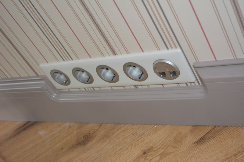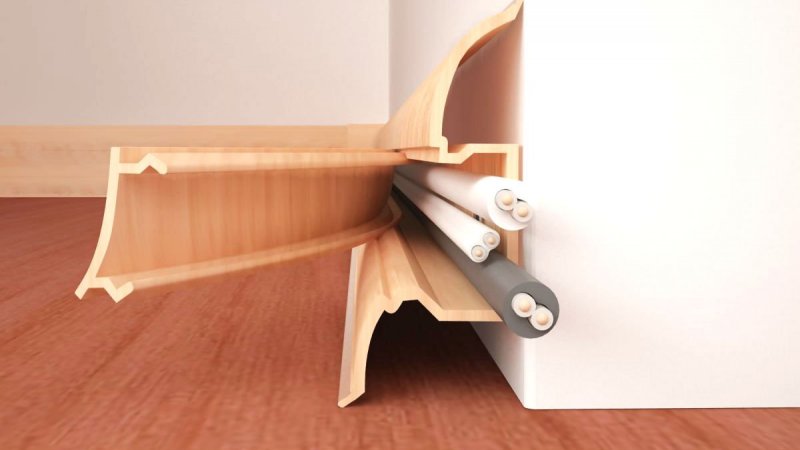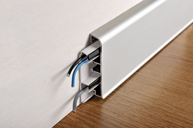 Разборные пластиковые плинтусы оснащаются отверстиями, в которые вкладывается шнур, несколько проводов одновременно. Преимущества плинтусов с кабель-каналами: