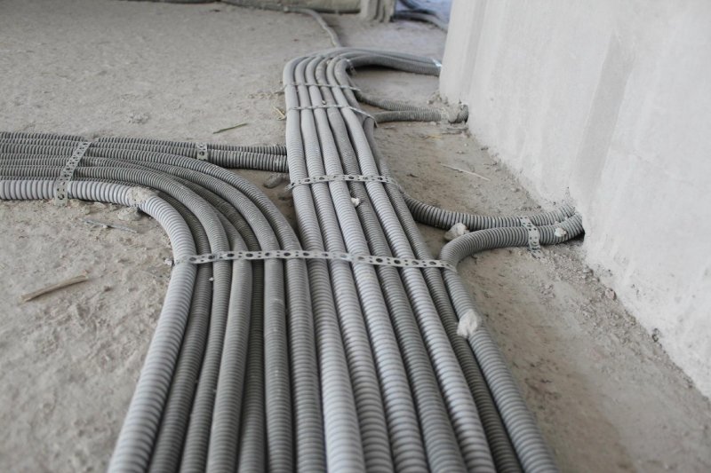 Важно подобрать наиболее прочную, тяжелую гофру под каждый шнур, а большую часть проводки монтировать на расстоянии 20-30 см от стены. Крепление к полу осуществляется при помощи гибкой перфоленты, текстильного материала либо на сетку.