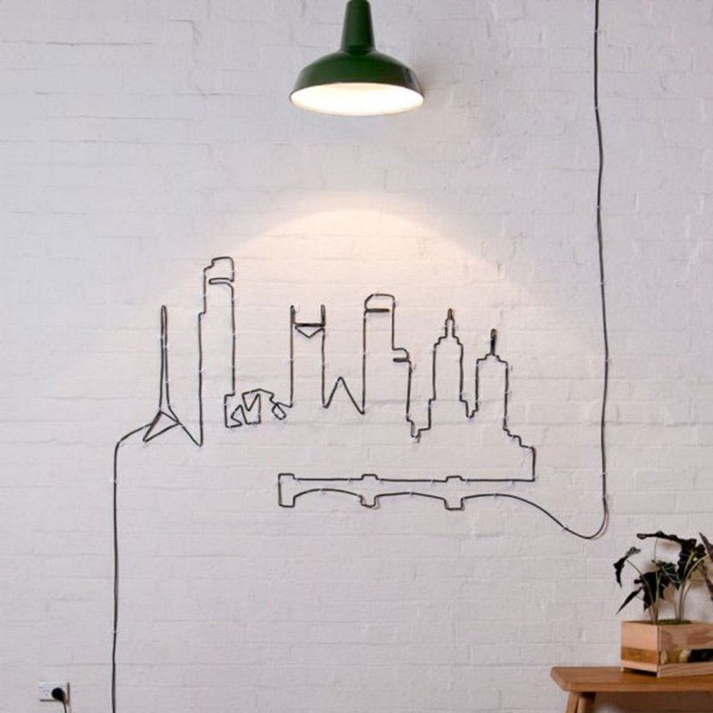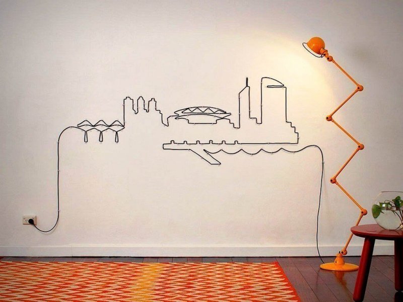 Из длинного шнура, контрастирующего со стенкой, вблизи которой он расположен, легко создать оригинальное контурное изображение. Когда шнуры достаточно длинные, что можно организовать намеренно, из них выкладывают геометрические узоры, целые сюжетные картины – панорамы городов, силуэты животных, профили людей, деревья, ножки и спинки мебели, обрамление зеркал.