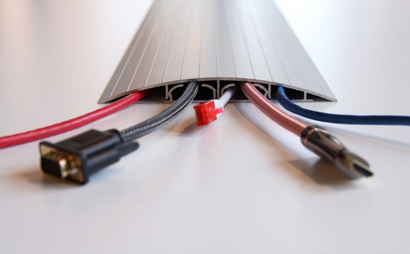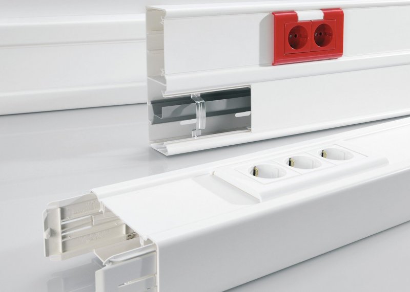 Кабель-каналы различаются по цвету, их легко заменить, дополнить новыми ответвлениями. Конструкция выполняется из пожаробезопасных материалов, шнуры в ней максимально защищены от повреждений извне, ультрафиолета. Минусом здесь считается то, что подобрать расцветку под некоторые стили интерьера (барокко, экологический, ампир, рустик и др.) проблематично, хотя конструкция выглядит намного лучше, чем свисающие отовсюду провода. Когда кабель-канал расположен на углу, любом выступе, его легко зацепить.