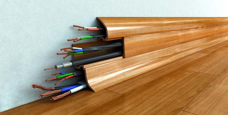 Кабель-канал располагается внутри конструкции по центру или в съемной верхней половине. Первый вариант подойдет, когда надо скрыть три-четыре провода, второй – для нескольких толстых шнуров. Плинтус важно выбрать по цвету, ширине, монтируют его от внутренних углов помещения. Все углы закрываются специальными декоративными накладками, приобретаемыми вместе с плинтусами.