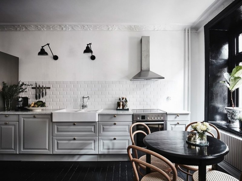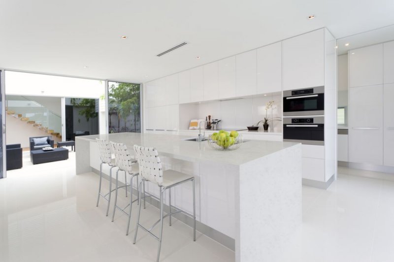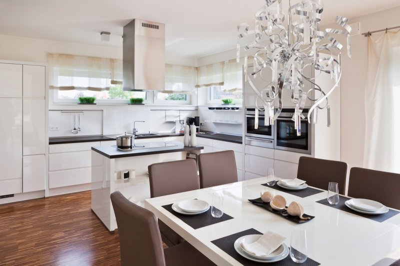 От белоснежного интерьера веет чистотой, морозной свежестью. Максимальной популярностью пользуются сочетания с черным, различными оттенками серого – плавные градиенты, выполненные в подобных тонах, смотрятся особенно хорошо. Полностью белоснежный интерьер дополняется редкими акцентами алого, черно-синего, шоколадно-коричневого. Кухонный фартук здесь оформляется панелями «под белый кирпич», полы – беленьким ламинатом, сам гарнитур выполняется из беленого дуба либо его качественной имитации.