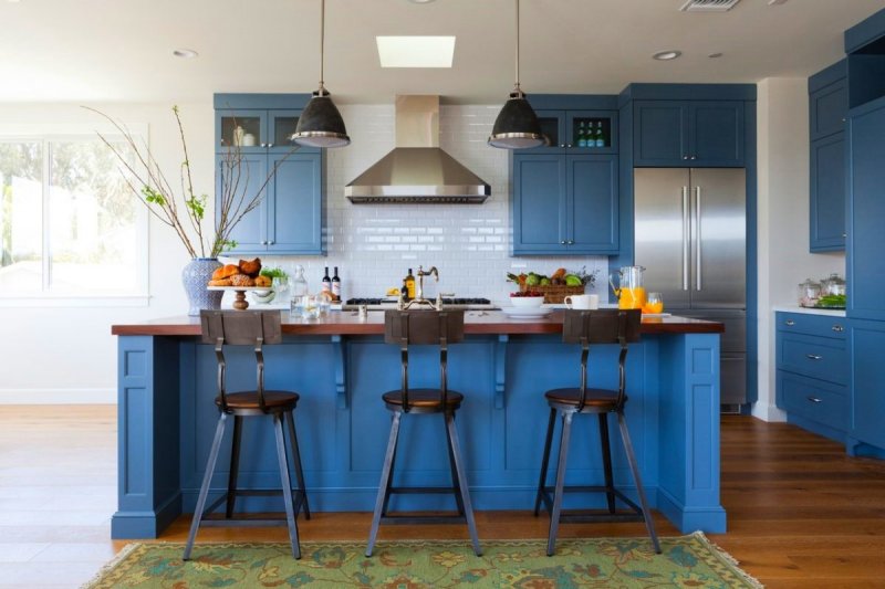 Оттенки синего желательно использовать в солнечных помещениях – чем просторнее комната, чем ярче она освещена, тем более насыщенные тона в ней допустимо применять. Колер успокаивает, снижает аппетит, добавляет комнате прохлады. Лучшие сочетания – с песочно-желтым, нежно-розовым, белоснежным, фиолетовым. Комбинации с черным в кухне не желательны, так как интерьер будет мрачноват, с коричневым – смотрится не очень красиво. Зону отдыха либо обеденную здесь выделяют фотообоями, изображающими подводный мир, небо с облаками, букеты колокольчиков, васильков.