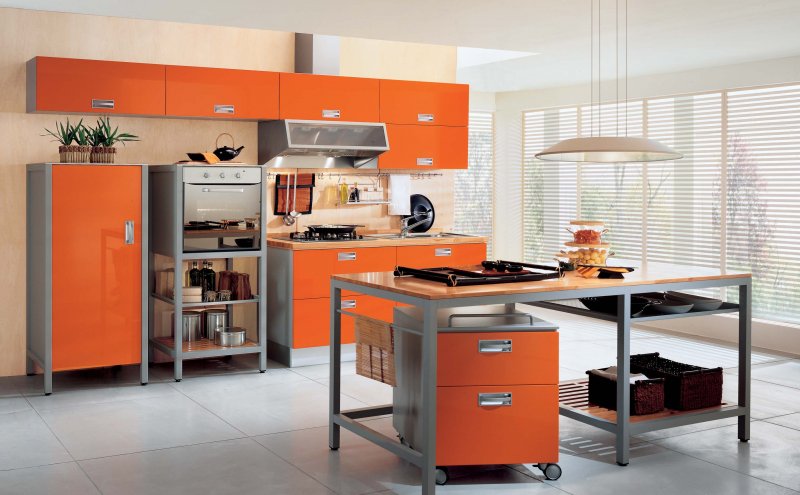 Апельсиновая кухня – солнечная и «аппетитная». В ней приятно и есть, и готовить, и проводить время с гостями. Любое, даже самое мрачное помещение, окрашенное в «оранж», станет теплее и светлее. Но чрезмерной яркости в узких и низких комнатах следует избегать – пространство зрительно станет теснее. Особенно красиво смотрятся сочетания с зеленым, стальным, прозрачно-голубым, бежевым, фиалковым.