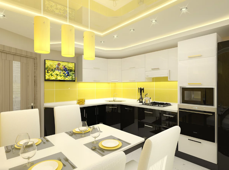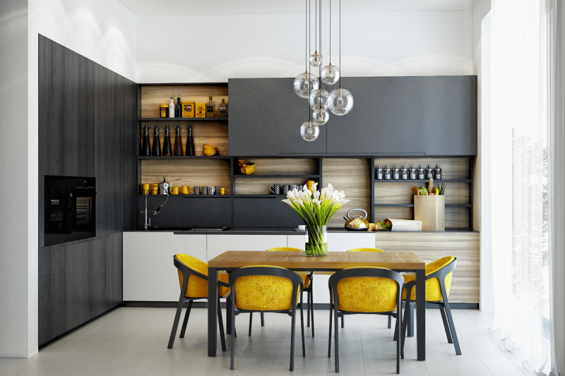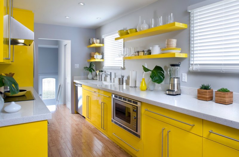 Желтыми в кухне делаются лампы – такой свет подойдет для обеденной зоны, рабочего мини-кабинета, если он предусмотрен. Данный колер – это светлая древесина, некоторые виды керамики. Наилучшие сочетания – с небесно-голубым, салатовым, коричнево-рыжим. Черные контрастные акценты добавят комнате динамичности, темно-синие также допустимы.