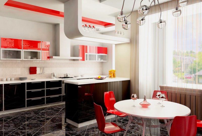 Кухня, выполненная в красных тонах, всегда яркая, запоминающаяся, создающая ощущение праздника. Цвет возбуждает аппетит, но заставляет есть быстро, потому часто используется в кафе. Чрезмерно яркие оттенки скрадывают пространство – маленьким комнатам алые, бордовые, насыщенно-розовые тона подойдут лишь в пастельном варианте либо как акцентные. В кухонном помещении красный сочетают с белоснежным, золотистым, серым, черно-коричневым.
