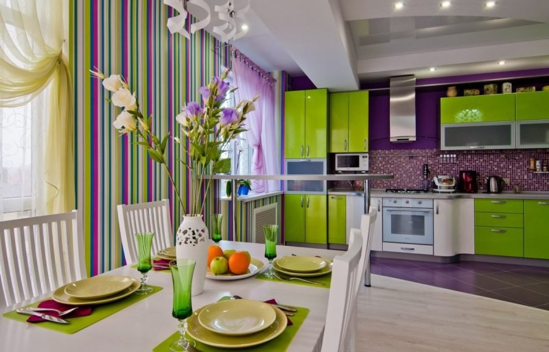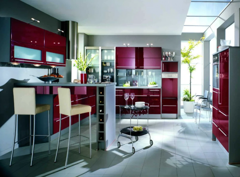 Яркий фиолетовый оптимально подходит для дизайна рабочей кухонной зоны, его пастельные оттенки – для места отдыха. Темные варианты обычно делаются акцентными – обрамление геометрических узоров на фасадах, обоях, принты с баклажанами и виноградом, картинки с гладиолусами, фиалками, орхидеями и др. Наиболее красивые сочетания – с оливково-желтым, морковным, розовым, белым, платиновым.