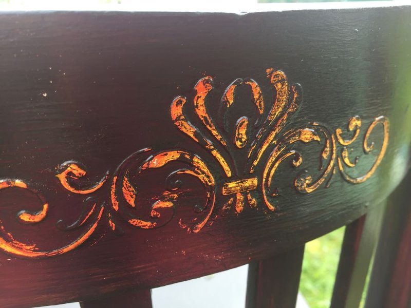 Художественная роспись. Нанесение оригинальных рисунков и узоров на подготовленную поверхность стула. Можно руководствоваться только полетом фантазии или использовать готовые трафареты.