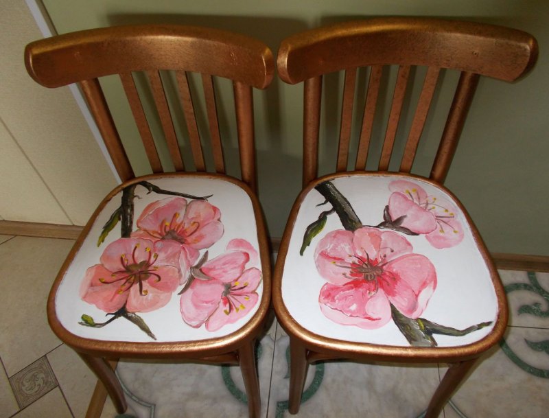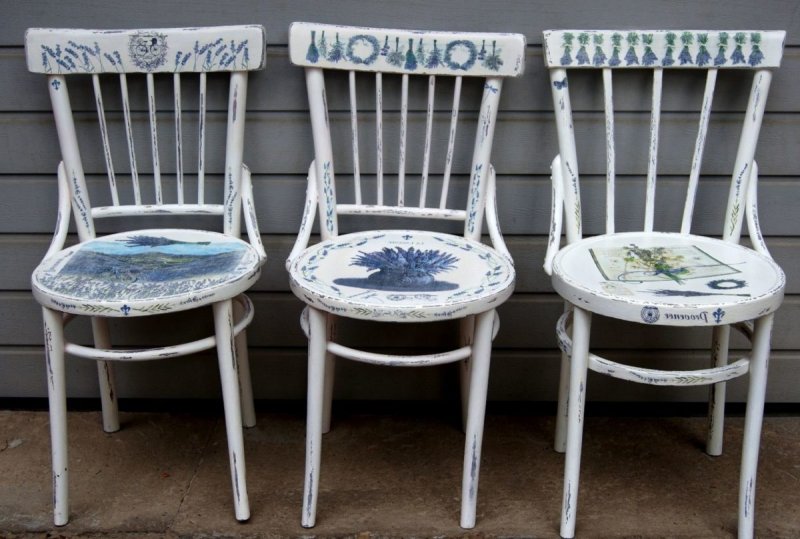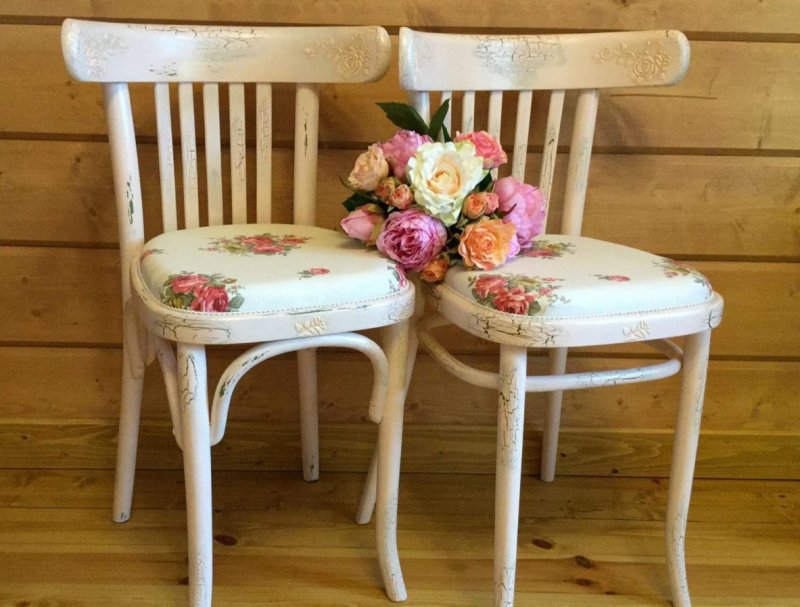 Декупаж. Популярная техника переноса изображений с бумажных носителей (открытки, салфетки) на поверхность стула с последующим закреплением картинки с помощью лака.