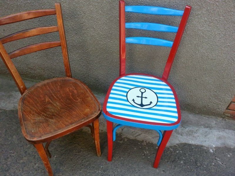 Отреставрировать стулья можно разными способами. Количество вариантов ограничивается только возможностями фантазии оформителя. Контрастная покраска с использованием двух-трех цветов подойдет для строгих интерьеров. Покрытие поверхности слоем краски с эффектом бронзы или золота и обшивка тканью, на которой золотистой нитью выведены узоры, позволит создать «ретро» настроение. Такое изделие подчеркнет особенности обстановки, оформленной в одноименном стиле. Белая покраска со следами от мазков кисточки и эффектом потертостей, великолепно сочетается с провансом. Дополнительно отдельную область (чаще всего уголок спинки стула) декорируют в технике декупажа с использованием картинок с флористическими мотивами. Твердые сиденья детских табуреток можно украсить забавными рожицами-смайлами.