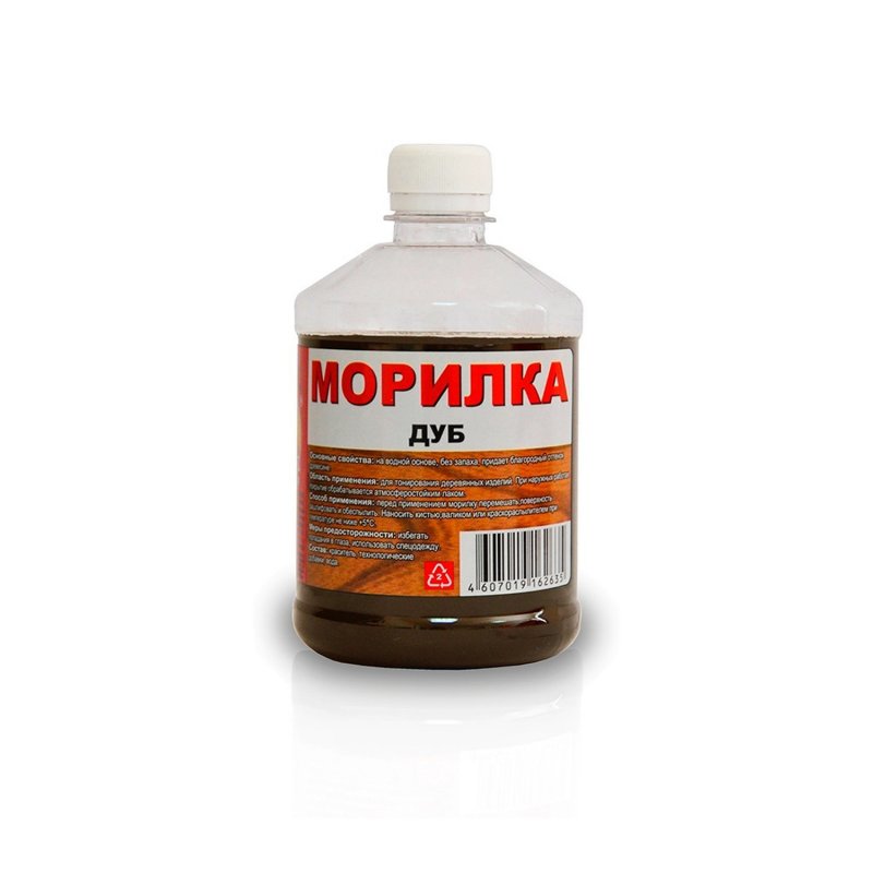 Смеси на олифе можно наносить любым инструментом и способом, вручную или краскопультом. Можно добиться разных, даже не свойственных породе оттенков, путем добавления красителя нужного цвета. Таким способом можно сделать белую, зеленую, красную морилку. Она долгое время сохранит насыщенность оттенка, поскольку не выгорает на солнце и не стирается.