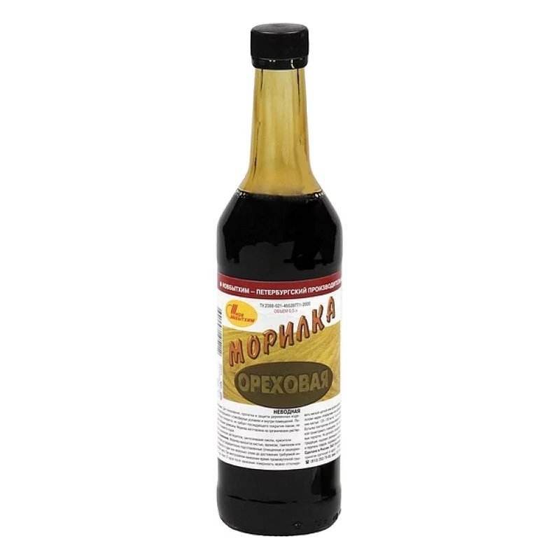 Дерево – популярный, востребованный строительный материал. Придать древесине можно любой оттенок. Для этого потребуется обработать ее специальной смесью. Морилка для дерева также является хорошим антисептиком. Срок службы обработанных деталей увеличивается в несколько раз. Лакокрасочные составы придают эстетичности, декоративности, подчеркивают текстуру любых пород. Содержание Особенности материала Виды морилки На водной основе На масляной основе На спиртовой основе Акриловая морилка Восковая морилка Морилки с эффектом отбеливания Цветовое разнообразие Правила и способы нанесения на поверхность Мастер-класс по тонированию древесины Расчет расхода Как выбрать морилку Работа с дефектами — что делать, если морилка легла неправильно Заключение Особенности материала Выпускают морилку в жидком виде, чаще – это состав темного цвета, способный придать дереву полупрозрачный оттенок. С ее помощью можно кардинально изменить внешний вид мебели. Жидкость проникает глубоко внутрь древесины, изменяя ее цветовую гамму без нарушения текстуры и рисунка. Специальные лаки используют при реставрации всевозможных изделий, для отбеливания, осветления. Главная особенность многофункциональных составов заключается в отсутствии пленки после высыхания, выявлении натурального рисунка. Поверхность становится контрастной и сочной. Обработка морилкой – самый эффективный способ защиты дерева от гниения и деформации. При работе можно сочетать различные оттенки смеси для всех пород – сосны, дуба, ореха, палисандра. Виды морилки Основным компонентом морилки может быть масло, вода или спирт. Типовое разделение позволяет выделить несколько видов материала, каждый из которых по-разному взаимодействует с древесиной. Одни – глубоко проникают в дерево, когда другие смеси меняют тон только верхнего слоя. На водной основе Самая большая группа пропиток. Смесь выпускается уже в готовом виде, не требующем дополнительной подготовки к нанесению, или в виде порошка. Второй вариант предпочтительней, поскольку появляется возможность самостоятельно регулировать оттенок. Насыщенность цвета будет зависеть от количества сыпучего вещества. Морилку на водной основе можно использовать снаружи и внутри жилого помещения. Она не имеет неприятного запаха, абсолютно не токсична. Состав имеет небольшой расход, легко наносится. Из недостатков можно отметить плохую водостойкость. После нанесения поднимаются волокна древесины, что открывает путь к влаге. Окрашенная поверхность долго сохнет – 12-15 часов. Не желательно применение для смолянистых пород древесины. Работать с водной морилкой просто своими руками. Технология заключается в предварительном намачивании и ошкуривании деталей. Наждачная бумага хорошо удаляет поднявшиеся волоски. Перед началом использования состав процеживают и хорошо перемешивают. Увеличить влагостойкость можно с помощью финишного лакового покрытия. На масляной основе Универсальные смеси на маслянистой основе включают в состав специальные маслорастворимые красители. Такая морилка быстро сохнет (2-4 часа), легко наносится, ровно ложится на любую поверхность, не вспучивая древесные волокна. С помощью такого состава можно без труда покрыть дерево равномерно и без потеков. В процессе подготовки к нанесению масляную морилку над