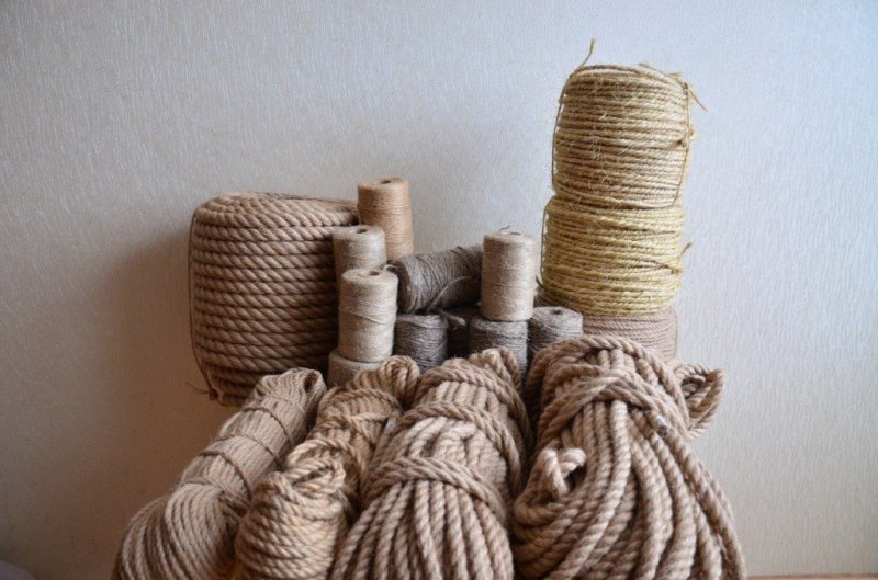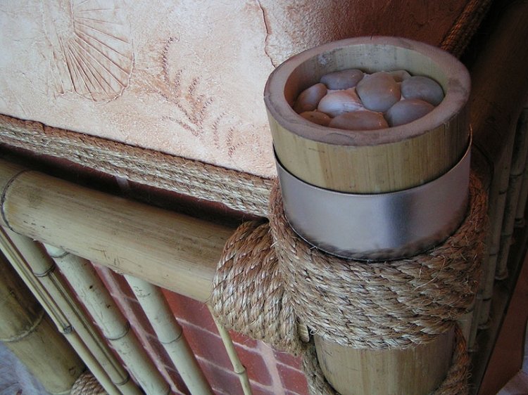 Оригинальный декор вертикальных и горизонтальных коммуникаций можно провести веревками. Для работы не рекомендуется использовать самые дешевые джутовые канаты (с неровной поверхностью), поскольку они быстро покрываются пылью и она тяжело удаляется. А вот аккуратные гладкие аналоги из джута (обычные или окрашенные) подойдут для использования в жилых комнатах, туалете. Вертикальную разводку с помощью такого материала можно стилизовать под дерево, пальму. Для подобного украшения в верхней части оплетаемых коммуникаций рекомендуется зафиксировать искусственную зелень, веточки с пластиковыми лимонами или апельсинами.