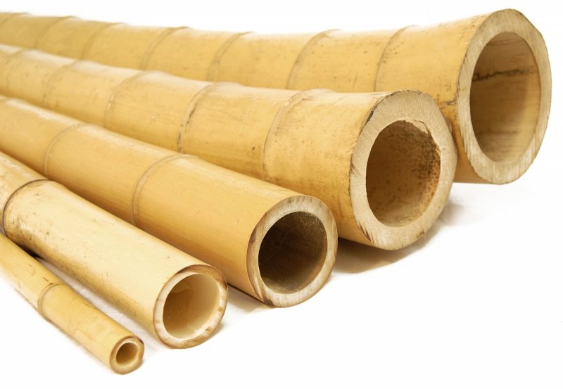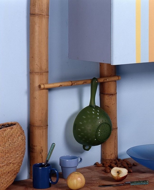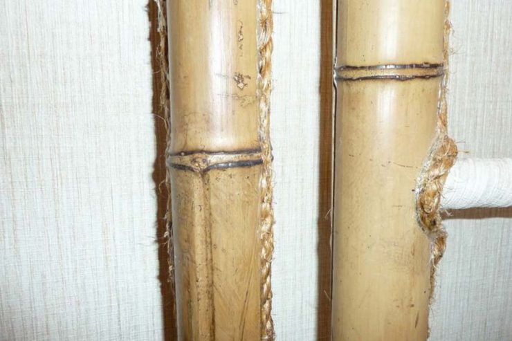Нестандартно задекорировать коммуникации в кухоньке, сантехнических помещениях и жилой комнате поможет использование бамбука. Полые стволы с разным диаметром продаются в строительных и садовых магазинах. Подбирать их рекомендуется, предварительно измерив диаметр оформляемых коммуникаций. При этом у выбранного бамбука внутренний диаметр полости должен быть хотя бы на 0,5 см больше. В противном случае могут возникнуть проблемы с их установкой. Закрыть коммуникации такими столбиками довольно легко. Необходимо сделать 1-2 вертикальных распила на бамбуке. А затем просто надеть его поверх трубных коммуникаций. При необходимости один из краешков можно проклеить клеем для надежной фиксации.