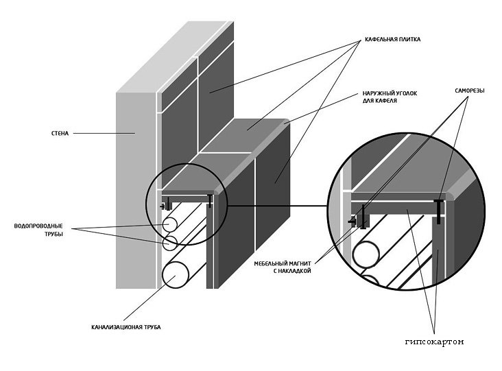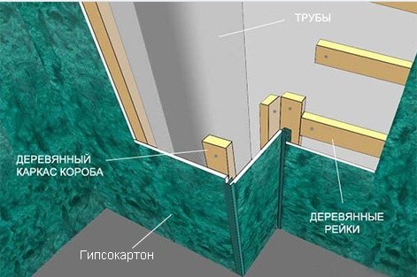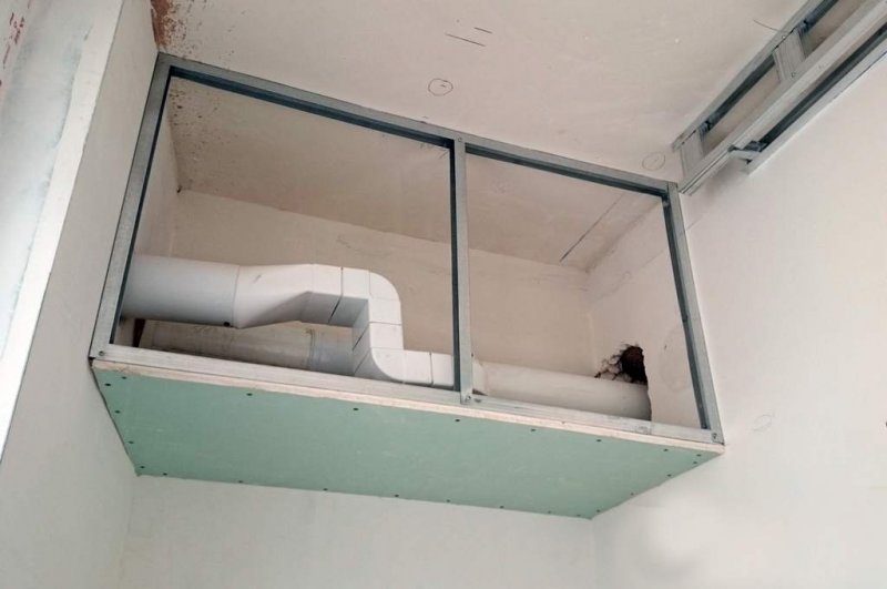Закрыть вытяжной вентиляционный короб, разводку для водопровода довольно легко, используя гипсокартон. Из него можно собрать любую по форме и размерам конструкцию, позволяющую изменить планировку помещения. При этом все коммуникации будут закрыты от посторонних глаз. Такой подход применим и для скрытия дымоходов. Работа по сборке конструкции проводится следующим образом: