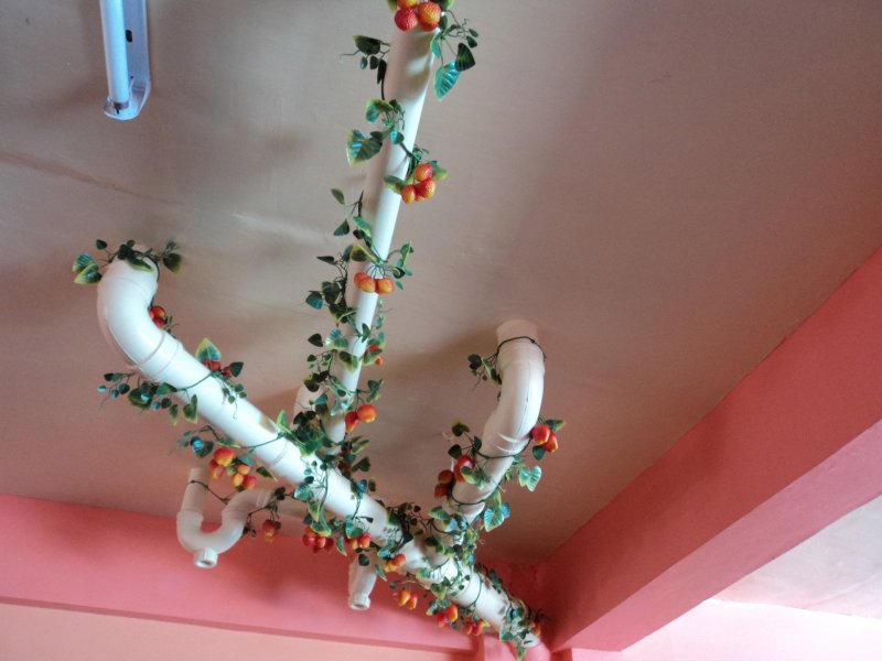 Используя краску, можно в коридоре или детской комнате, гостиной стилизовать вертикальную разводку под дерево. Для этого на стенке изображается крона, а сами трубки выступают в качестве ствола.