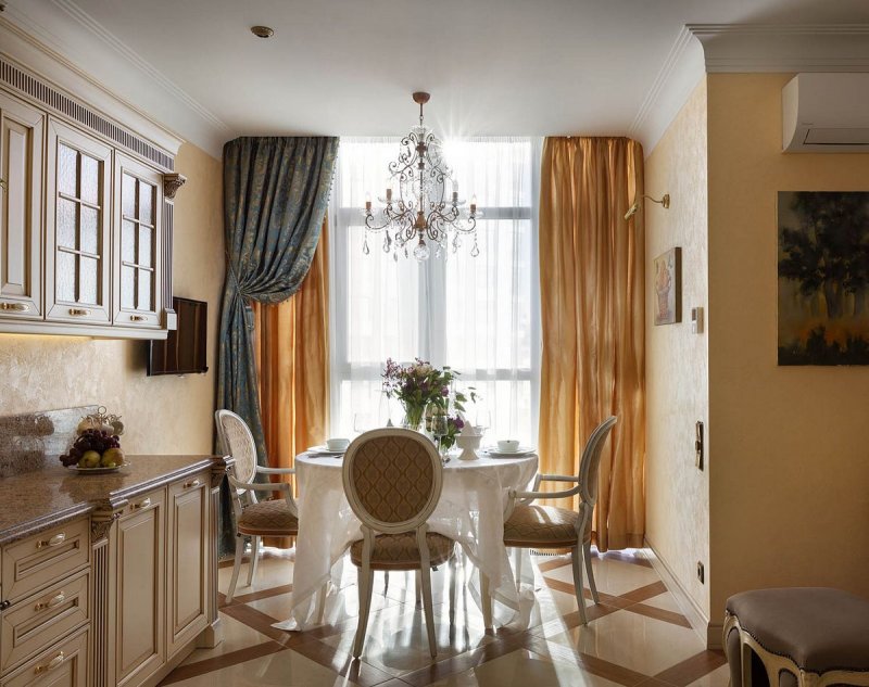 Кухонное помещение, особенно зона приготовления пищи, часто подвергается воздействию грязи, жира, капель напитков и еды. Потому занавески, подбираемые сюда, должны легко очищаться, не терять красивого внешнего вида, даже при частых стирках. Шторы в этой комнате сочетают по цвету с ковром, скатертью, обивкой мебели столовой зоны либо гарнитуром, кухонным фартуком, мелкими текстильными элементами, расположенными в зоне готовки. Пышные, фактурные изделия допустимы, если расположены на достаточном (более двух метров) расстоянии от плиты, мойки, разделочного стола.