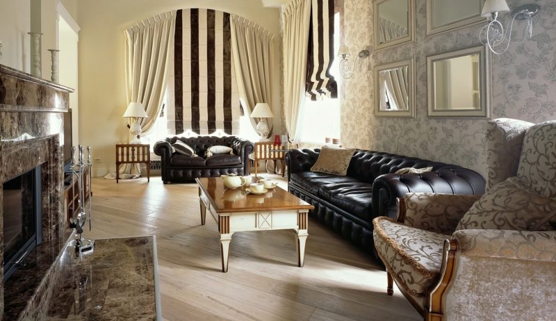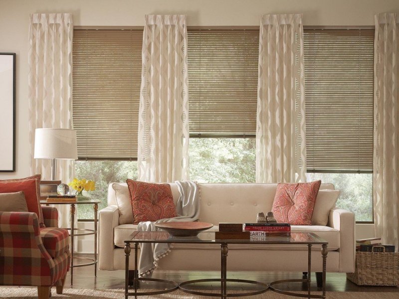 Гостиное помещение часто имеет несколько окон – их все желательно декорировать одинаковыми занавесками. Так как зал обычно – самая просторная комната в доме, его оформляют: