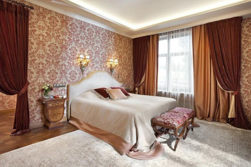 если настенное покрытие матовое, занавески подойдут атласные, шелковые, матовые портьеры вешают на фоне тисненых, блестящих обоев, фотообоев;