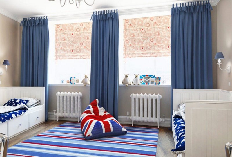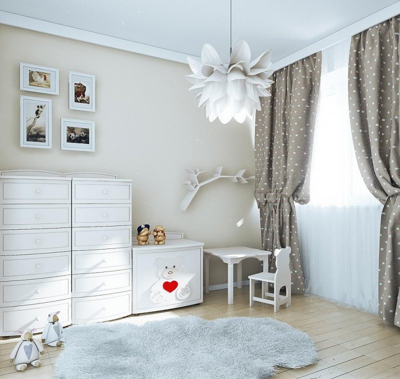 Детская комната декорируется занавесками, пошитыми из немаркой, предпочтительно натуральной ткани. Вопрос безопасности не менее важен – карниз, как и шторы на нем, необходимо закреплять так, чтобы ребенок при всем желании оторвать их не мог. Слишком длинные, «лежащие на полу» варианты, недопустимы – за них легко зацепиться, поскользнуться, упасть. Чрезмерно пышные занавеси непрактичны, да и занимают много свободного места, которое лучше использовать для игр. Красители, используемые для окраски шторной ткани, должны быть экологичными, не выцветать, не «мазаться» при прикосновении мокрыми руками. Идеально подойдут портьеры из бамбука, хлопка, льна. Комната спокойного ребенка декорируется яркой драпировкой, активного – шторами спокойных расцветок. Подойдут также ненавязчивые принты с милыми зверушками, героями сказок, мультфильмов.