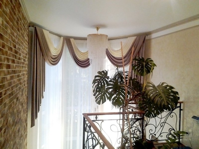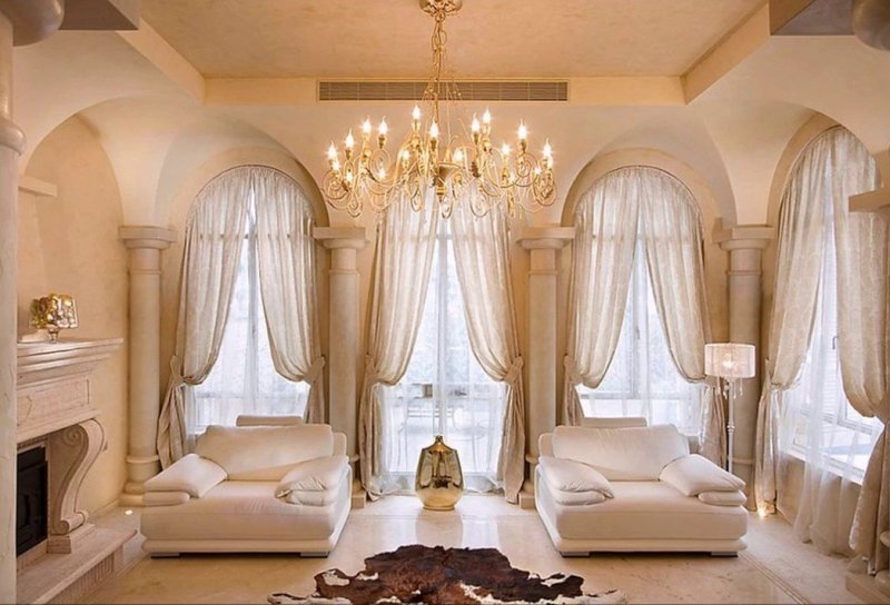 Арочные окошки сами по себе смотрятся роскошно, дорого. Драпировки на них подбирают соответствующие. Карниз здесь монтируется: