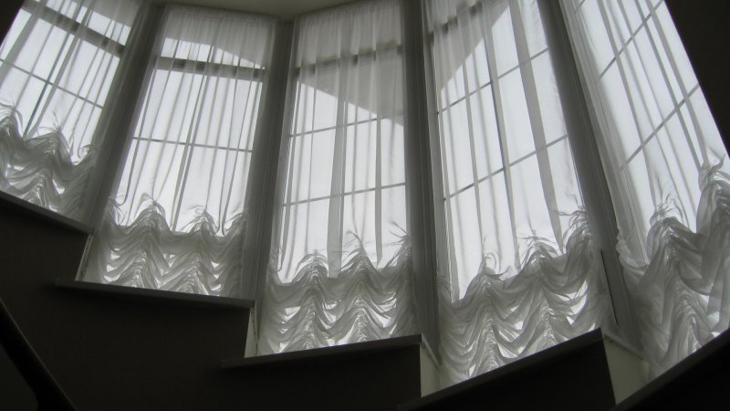 На лестнице ничто не должно мешать свободному передвижению – объемные, многослойные варианты недопустимы, особенно, если ширина лестничного проема менее 1,5 метра, а также, когда в доме проживают люди с плохой координацией движения, маленькие дети. По той же причине края портьер не должны «лежать» на полу. Маленькие окошки, задача которых – освещать лестницу днем, драпируют тюлем, другими прозрачными тканями. Большим подойдут рулонные шторы, горизонтальные либо вертикальные жалюзи, классические занавески.