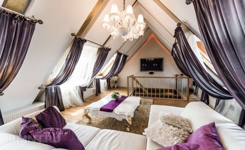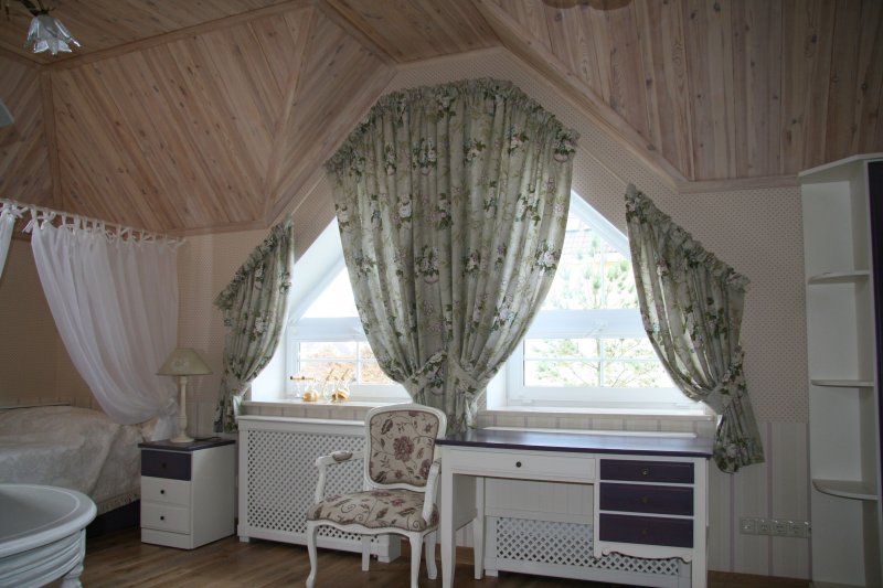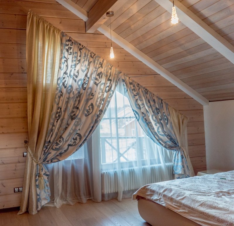Мансардная комната в частном домостроении обычно делается полностью деревянной, оконные рамы – тоже. Такие помещения предпочтительно оформлять занавесками из натуральных, не слишком ярких тканей, натянутых между верхним и нижним карнизами. Если пространство достаточно обширное, допускается, чтобы портьеры слегка провисали. Тесным комнаткам рекомендуются рулонные варианты пастельных расцветок, пластиковые жалюзи.