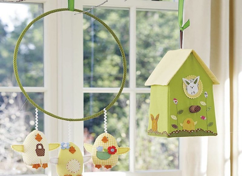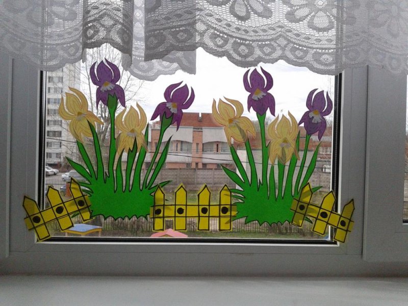 Если позволяет пространство, все описанные элементы делаются объемными, в том числе закрепляемыми не только на самом окне, но и на занавесках. Весенние цветы (тюльпаны, нарциссы), расставляются в вазочках на подоконнике.